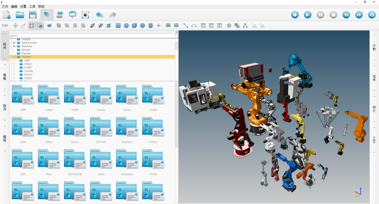 ( 1 )仿真系統(tǒng)支持 50 種以上的各品 牌機(jī)器人模型和大量生產(chǎn)線(xiàn)組件庫(kù);