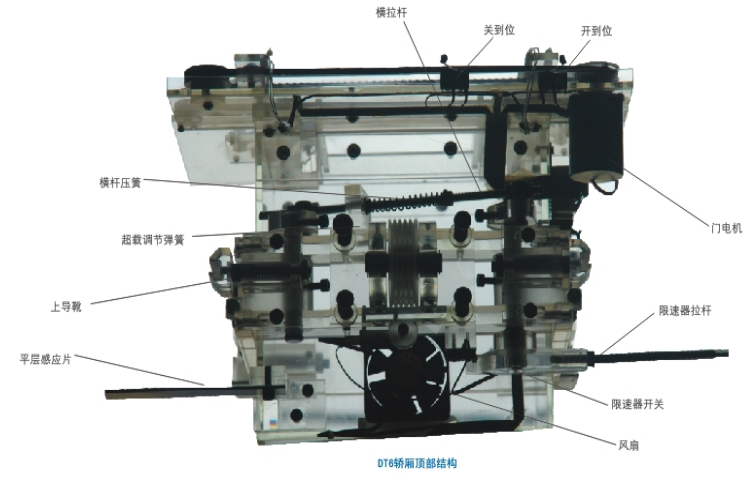 5 、轎廂部分:包括轎廂、轎門及觸板、限速器開關、限速器拉桿、安全鉗、導靴、門機機構、開到位開關、關到位開關、平層感應裝置、轎廂照明、風扇等。