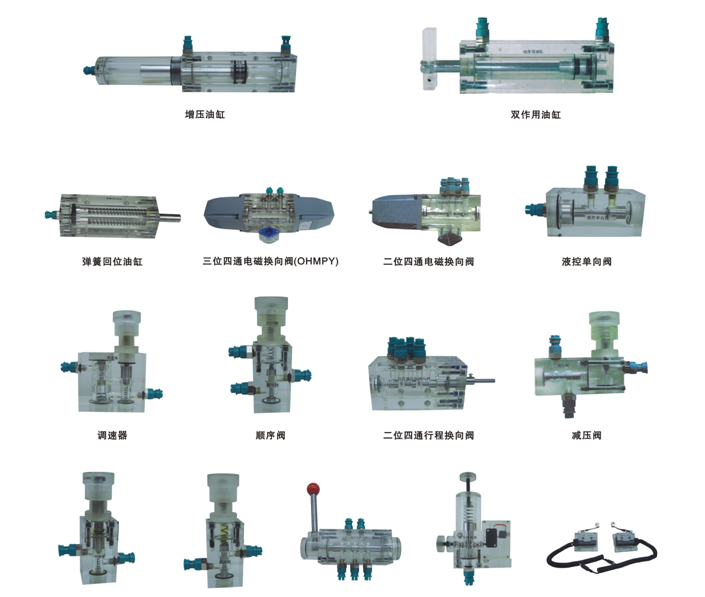 4、實訓元件均為透明有機材料制成,便于了解掌握幾十種常用液壓元件的結(jié)構(gòu),性能及用途。掌握幾十種基本回路的工作原理,實驗組裝回路快捷、方便。