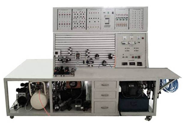實驗臺主要由雙面鋁合金T型槽臺架,液壓泵站及液壓元件,空氣壓縮機及氣動元件,電氣模塊及插銷板。PLC可編程控制器等組成。