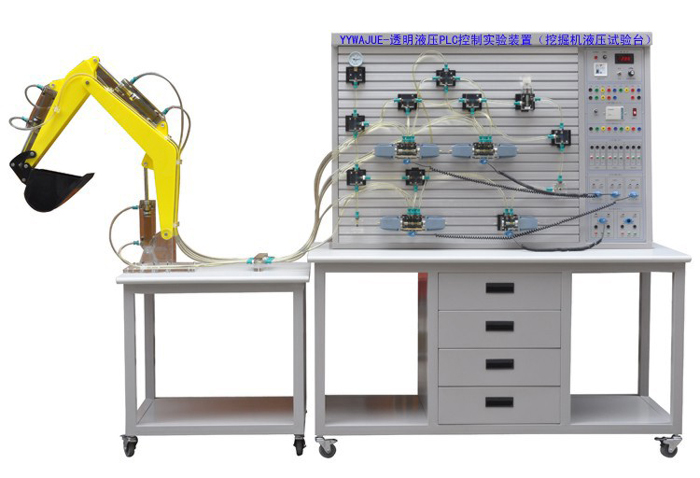 透明液壓PLC控制實(shí)驗(yàn)裝置(挖掘機(jī)液壓試驗(yàn)臺(tái)可模擬真實(shí)挖掘機(jī)工作裝置的各種動(dòng)作。液壓系統(tǒng)采用進(jìn)口透明機(jī)玻璃液壓元件、透明尼龍軟管搭接而成,液壓元件結(jié)構(gòu)、工作原理,液壓回路工作原理一目了然。整個(gè)試驗(yàn)臺(tái)具有形象、直觀、方便、可靠等優(yōu)點(diǎn)。