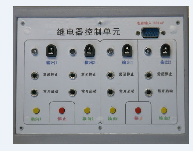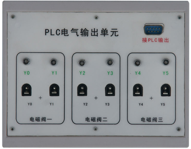 (4)輸入模塊:與PLC采用電纜9針232接口連接。連接后為PLC提供8路主令輸入信號(其中2路為常閉信號),及通過信號插孔為PLC提供自動控制信號。(如:行程開關(guān)位置信號等);輸出模塊:與PLC采用電纜9針232接口連接。通過輸出接口插孔控制電磁閥通斷;繼電器控制模塊:與電源模塊連接后,進(jìn)行主令信號控制,及提供自動控制信號接口進(jìn)行自動控制。通過輸出口插孔控制電磁閥通斷。