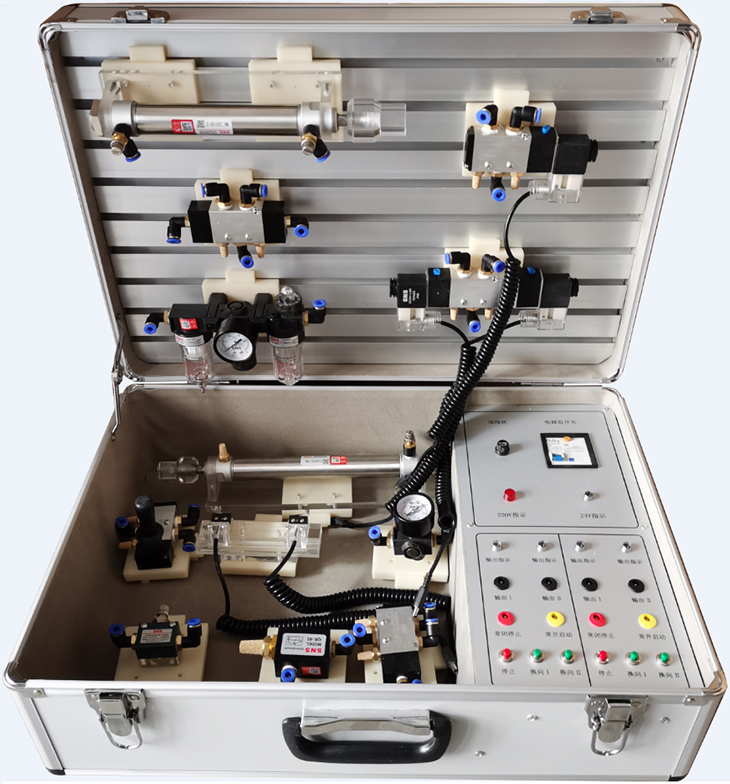 1、實(shí)訓(xùn)箱主要由鋁合金機(jī)箱、各種標(biāo)準(zhǔn)氣動(dòng)工業(yè)元件、和電氣控制器件等組成。