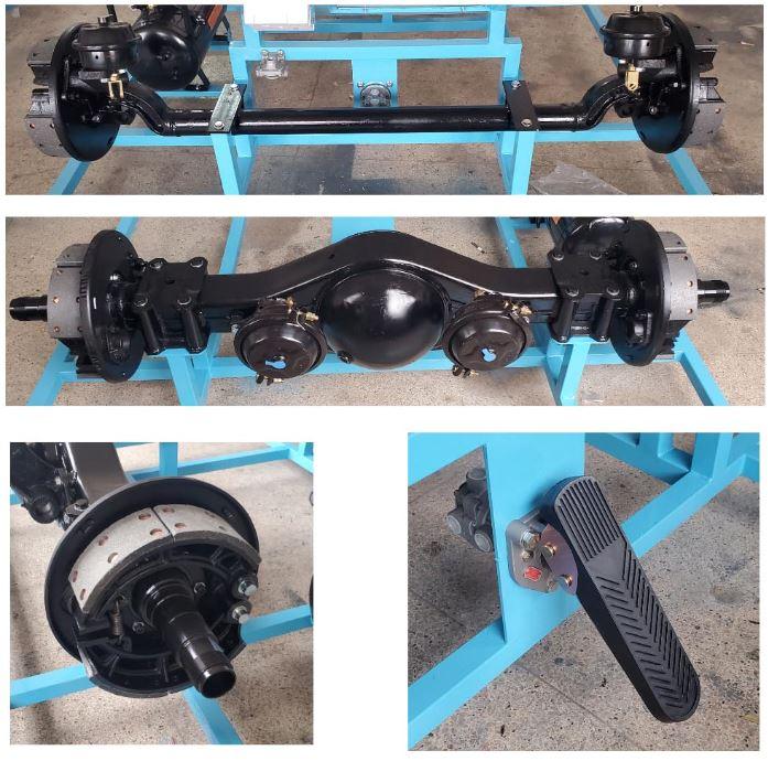 采用貨車氣壓制動(dòng)系統(tǒng)的所有配件,增加完整的前橋,后橋
