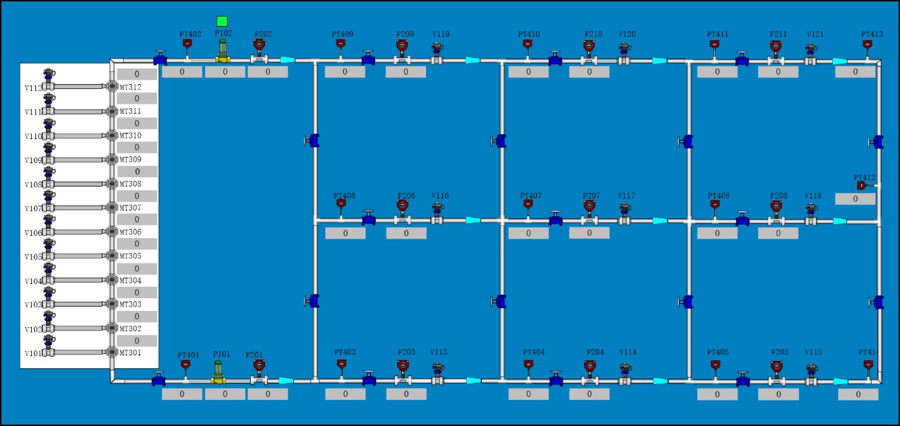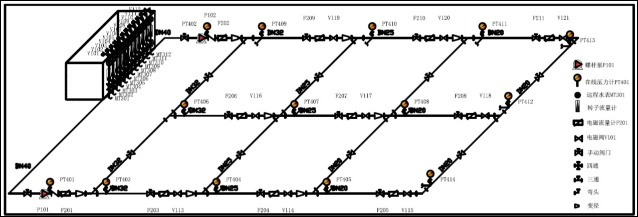 市政給水管網(wǎng)中的水流狀態(tài),是一個隨供水壓力和實際用水量變化而時時改變的復雜狀態(tài)。室外給水管網(wǎng)仿真實驗通過對水泵工作頻率的改變來實現(xiàn)水泵工作揚程的改變,從而模擬市政給水管網(wǎng)供水壓力的變化;通過調整用水節(jié)點閥門的開啟來實現(xiàn)管網(wǎng)中用水量的變化,從而來觀察由于供水壓力、水量和節(jié)點出流的改變而引起的管網(wǎng)工作狀態(tài)的變化和觀察室外給水管道系統(tǒng)的管中流量、節(jié)點壓力變化、管道水頭損失等過程。