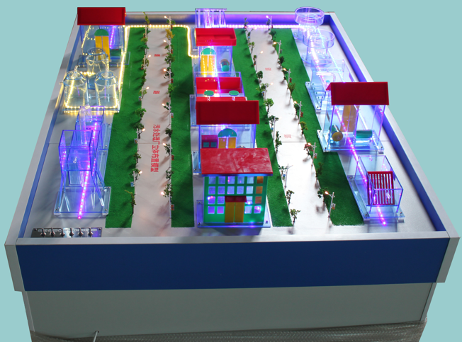 本裝置是典型污水處理廠的平面布置模型。通過對模型的觀察使學(xué)生能直觀的了解其典型污水處理工藝流程,對以后的教學(xué)設(shè)計提供幫助。