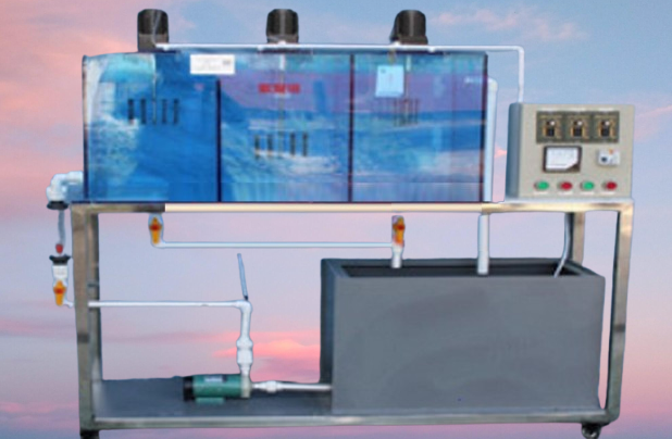 給水處理中澄清工藝通常包括混凝、沉淀和過濾,處理對(duì)象主要是水中懸浮物和膠體雜質(zhì)。原水加藥后,經(jīng)混凝使水中懸浮物和膠體形成大顆粒絮凝體,而后通過沉淀池進(jìn)行重力分離。機(jī)械反應(yīng)斜板沉淀池就是混凝、絮凝沉淀兩種功能的凈水構(gòu)筑物。本模型就是展示絮凝反應(yīng)池和斜板沉淀池內(nèi)部構(gòu)造的實(shí)驗(yàn)裝置。希望達(dá)到以下目的: