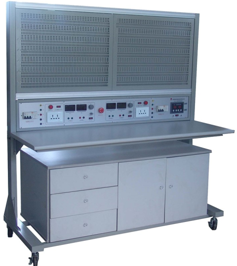 本實訓(xùn)臺由實訓(xùn)屏(內(nèi)置電源)、實訓(xùn)桌、實訓(xùn)儲物柜三大部分組成。