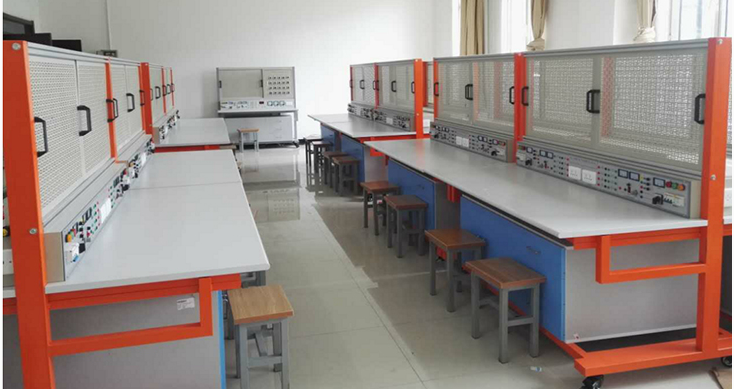 2 、實訓(xùn)桌桌面采用 25mm 麻灰色高密度層壓板封邊特制,有效提高絕緣等級;實驗桌底部裝有至少 4 個導(dǎo)向輪,方便實訓(xùn)臺架移動;