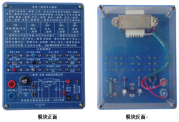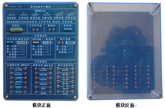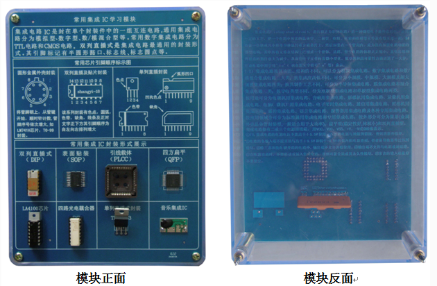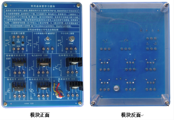 底盒使用 190mm × 145mm 的開模有機(jī)透明塑料底盒,模塊面板采用印制電路板 PCB 工藝,可以直觀看到器件的實(shí)物及相關(guān)的原理介紹。對(duì)于典型應(yīng)用及易損器件安裝在面板背面,透過透明底盒能夠看到器件實(shí)物,方便感性認(rèn)識(shí)、檢測測試,同時(shí)也能防止器件的損傷。