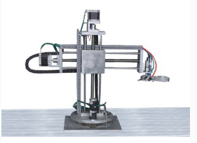 4. 搬運(yùn)機(jī)器人:檢測(cè)單元檢測(cè)到產(chǎn)品分類信息時(shí),通過(guò)通信網(wǎng)絡(luò)將檢測(cè)結(jié)果傳送到該站,該站通過(guò)坐標(biāo)式氣動(dòng)機(jī)器人將從生產(chǎn)線上送來(lái)的成品送往全自動(dòng)堆垛機(jī),主要由四自由度氣動(dòng)機(jī)械手組成,電氣控制部分由 PLC 完成。