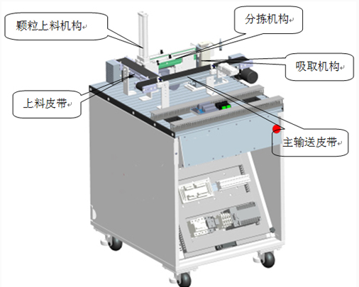 上料皮帶逐個將空瓶輸送到主輸送皮帶;同時顆粒上料機構(gòu)將料筒內(nèi)的物料推出;顆粒分揀機構(gòu)對顆粒物料根據(jù)顏色進行分揀;當空瓶到達填裝位后,皮帶停止,定位夾緊機構(gòu)將空瓶固定;吸取機構(gòu)將分揀到位的顆粒物料吸取放到空瓶內(nèi);瓶子內(nèi)物料到達設定的顆粒數(shù)量后,定位夾緊機構(gòu)松開,皮帶啟動,將瓶子輸送到下一個工位。此單元可以設定多樣化的填裝方式,可從物料顏色( 2 種)、顆粒數(shù)量(最多 4 粒)進行不同的組合,產(chǎn)生 8 種填裝方式。