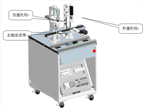 接收上一工作站填裝好顆粒的瓶子,當瓶子被輸送到加蓋機構(gòu)后,主輸送皮帶停止,夾蓋定位夾緊機構(gòu)將瓶子固定,加蓋機構(gòu)啟動加蓋流程,將蓋子加到瓶子上;加好蓋子后主輸送皮帶啟動,加上蓋子的瓶子繼續(xù)被送往擰蓋機構(gòu),到擰蓋機構(gòu)下方,主輸送皮帶停止,擰蓋定位夾緊機構(gòu)將瓶子固定,擰蓋機構(gòu)啟動,將瓶蓋擰緊,主輸送皮帶啟動,將擰好蓋子的物料瓶輸送到下一工位。瓶蓋分為白色和黑色兩種。