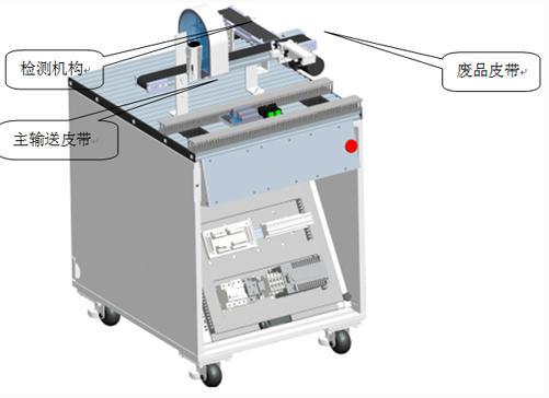 主皮帶運行,接收上一站擰好蓋后的物料瓶子,當物料瓶經(jīng)過檢測機構(gòu)時:回歸反射傳感器檢測瓶蓋是否擰緊;檢測機構(gòu)檢測瓶子內(nèi)部顆粒是否符合要求;對擰蓋與顆粒均合格的瓶子進行瓶蓋顏色判別區(qū)分;擰蓋或顆粒不合格的瓶子被分揀機構(gòu)推送到廢品皮帶上(短皮帶);擰蓋與顆粒均合格的瓶子被輸送到皮帶末端,等待機器人搬運。