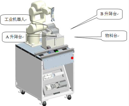 AB兩個升降臺分別存儲包裝盒底和包裝盒蓋;工業(yè)機器人包裝工作站啟動后, A 升降臺將包裝盒底推向物料臺上, A 升降臺隨之上升一個盒底位;等待上一站檢測合格的物料瓶到位,當上一站合格物料瓶到位,啟動工業(yè)機器人將瓶子抓取,并放入物料臺上的包裝盒底內(nèi);當包裝盒底 4 個工位放滿瓶子,工業(yè)機器人自動從 B 升降臺上吸取盒蓋,蓋在包裝盒上, B 升降臺隨之上升一個盒蓋位,并通知成品自動入庫工作站入庫。