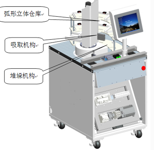 由一個弧形立體倉庫和 2 軸伺服堆垛機構(gòu)組成,當工業(yè)機器人工作站完成包裝任務,接收信號把機器人工作站物料臺上的包裝盒體吸取出來,然后按要求依次放入倉儲相應倉位。 2 × 3 的倉庫每個倉位均安裝一個檢測傳感器,堆垛機構(gòu)水平軸為精密分度盤機構(gòu),垂直機構(gòu)為渦輪絲桿升降機構(gòu),均由西門子 V90 精密伺服電機進行高精度控制。