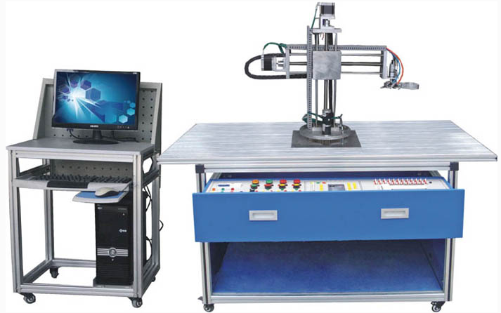 工業(yè)機(jī)械手實訓(xùn)裝置為坐標(biāo)式機(jī)械手,可完成機(jī)械手旋轉(zhuǎn)、手臂垂直上下移動、手臂水平移動,手爪旋轉(zhuǎn)四個自由度的位置精確控制。同時配置晶體管式可編程控制器,用于對整個機(jī)械手進(jìn)行復(fù)雜的位置控制。通過在該實訓(xùn)裝置上的實訓(xùn)和操作,學(xué)生可熟練掌握 PLC 高級指令、傳感器、旋轉(zhuǎn)編碼器、氣動控制、步進(jìn)電機(jī)、氣動手指、直流電機(jī)、精確機(jī)械位置傳動等技術(shù)的綜合應(yīng)用。