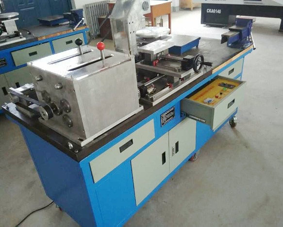 4、二維工作臺(tái):主要由滾珠絲桿、直線導(dǎo)軌、臺(tái)面、墊塊、軸承、支座、端蓋等組成。臺(tái)面采用鋁合金材料,分上下(X軸、Y軸)兩層,下層由多級(jí)變速箱經(jīng)齒輪傳動(dòng)控制,實(shí)現(xiàn)工作臺(tái)往返運(yùn)行,工作臺(tái)面裝有行程開(kāi)關(guān),實(shí)現(xiàn)限位保護(hù)功能,上層采用手輪實(shí)現(xiàn)手動(dòng)控制;能完成直線導(dǎo)軌、滾珠絲桿、二維工作臺(tái)的裝配工藝及精度檢測(cè)實(shí)訓(xùn)。
