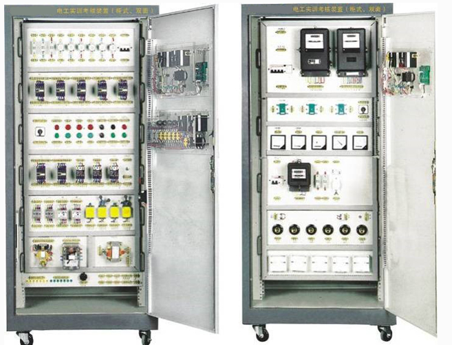 電機(jī)電控配線安裝實(shí)訓(xùn)柜以標(biāo)準(zhǔn)的配電柜為主柜,合理利用柜體的雙面空間,科學(xué)地布置電器及配套實(shí)驗(yàn)器材,面板裝有電流、電壓表及操作按鈕,內(nèi)部裝有完成電動機(jī)控制電路所需要的各種低壓電器,如漏電斷路器、熔斷絲、電流互感器、接觸器、中間繼電器、熱繼電器、行程開關(guān)按鈕、信號燈、轉(zhuǎn)換開關(guān)、電壓表、電流表等,為了延長電器使用壽命,各電器的接點(diǎn)都先與接線端子相連,再在端子上接線操作,以求經(jīng)久耐用,能滿足照明電路和電動機(jī)控制電路的實(shí)訓(xùn)項(xiàng)目。