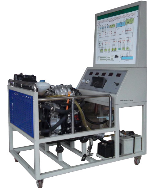 發(fā)動機總成和發(fā)動機控制單元、原車線束、儀表總成、冷卻液溫度傳感器、進氣溫度傳感器、節(jié)氣門控制總成、進氣壓力、氧傳感器、點火開關(guān)、整套散熱機構(gòu)、汽油箱和汽油泵總成、蓄電池、五個數(shù)字電壓表、真空壓力表及燃油壓力表、帶有完整彩色電路原理圖面板、外接式檢測端子、智能故障設置盒總成、可移動臺架、使用說明書及實驗指導書。