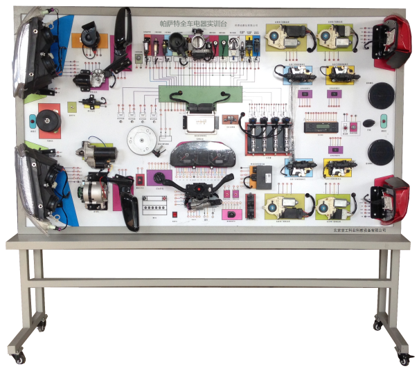 該 帕薩特B5 全車電器實訓臺采用 帕薩特B5 整車電器實物為基礎(chǔ),充分展示汽車發(fā)動機防盜系統(tǒng)、儀表系統(tǒng)、燈光系統(tǒng)、雨刮系統(tǒng)、喇叭系統(tǒng)、點火系統(tǒng)、電動車窗系統(tǒng)、電動門鎖、音響系統(tǒng)、起動系統(tǒng)和充電系統(tǒng)等汽車電器各系統(tǒng)的組成結(jié)構(gòu)和工作過程。