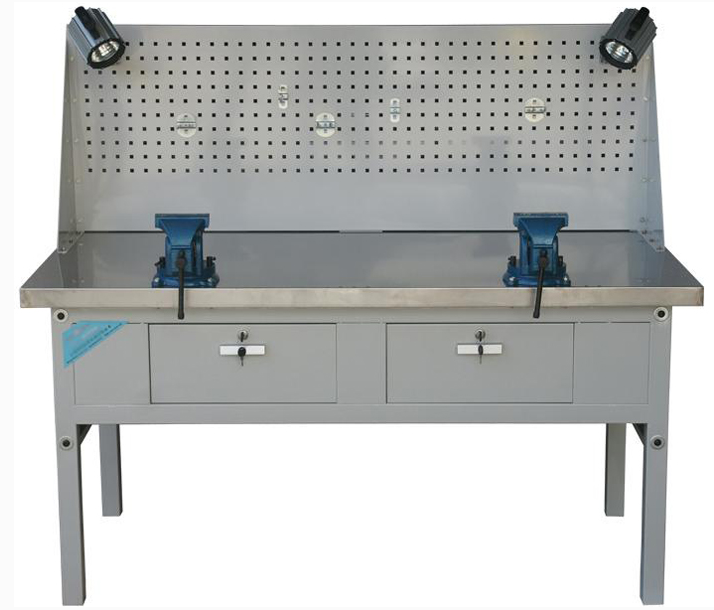 1 、 jgZQG-2 型鉗工桌采用標準的組合式拆裝結(jié)構(gòu)、構(gòu)件互換一致性好。具有單面二工位、二個大容積的暗鎖抽屜、可調(diào)重型墊腳。以利于運輸、安裝、存儲放置、適應于各種不同實訓場地。
