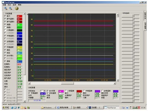 2)、軟件控制,能在線控制系統(tǒng)的溫度,讀取機(jī)組在最佳溫度系統(tǒng)制冷冷媒的流量開(kāi)度數(shù),調(diào)整制冷機(jī)組的過(guò)熱度,過(guò)冷度。該文本顯示界面的左側(cè),以文本的形式實(shí)時(shí)顯示當(dāng)前機(jī)組的運(yùn)行數(shù)據(jù)。在界面右側(cè)的上半部分,是對(duì)通訊信息的顯示,包括通訊角色及通訊端口的設(shè)定值以及對(duì)當(dāng)前通訊狀態(tài)的顯示。在界面右側(cè)的下半部分 " 數(shù)據(jù)信息 " 中,顯示當(dāng)前接收到哪種數(shù)據(jù)幀、接收到的數(shù)據(jù)幀的地址、等信息。具有上位機(jī)調(diào)節(jié)的線上和手動(dòng)調(diào)節(jié)功能: