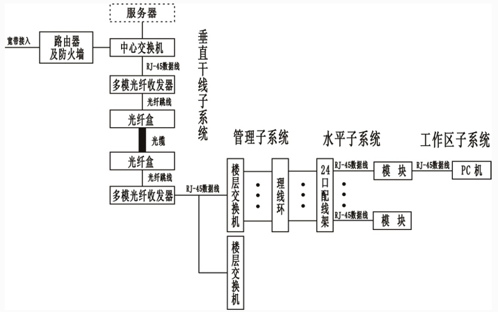 數(shù)據(jù)網(wǎng)絡(luò)由路由器、中心交換機(jī)、光纖收發(fā)器、光纖盒、樓層交換機(jī)、理線環(huán)、配線架、信息模塊等組成。